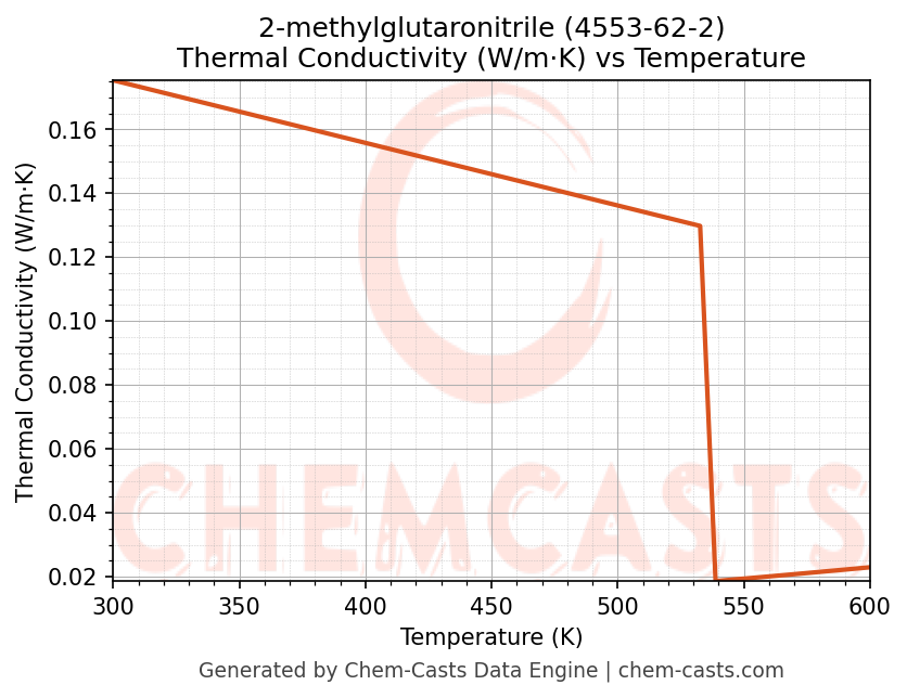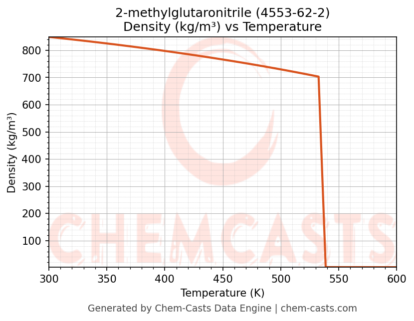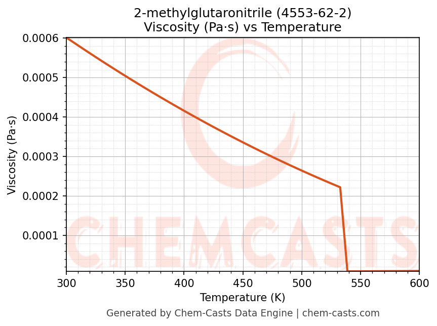 This page presents the temperature-dependent thermodynamic and transport properties of 2-methylglutaronitrile (CAS 4553-62-2) calculated at a constant pressure of 1 atm (101325 Pa) over the temperature range 250-500 K.