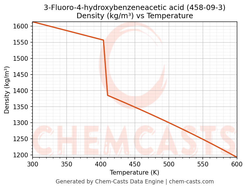 This page presents the temperature-dependent thermodynamic and transport properties of 3-Fluoro-4-hydroxybenzeneacetic acid (CAS 458-09-3) calculated at a constant pressure of 1 atm (101325 Pa) over the temperature range 250-500 K.