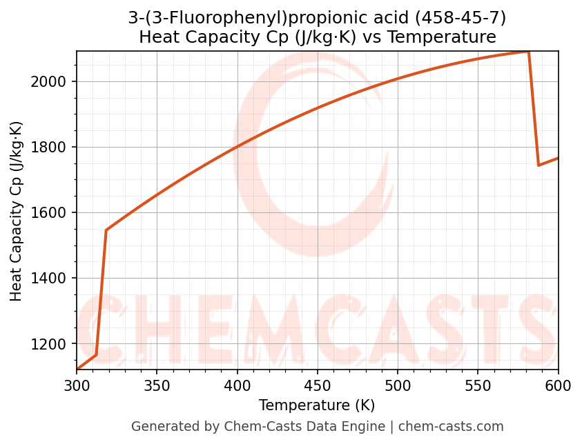 - Specific heat capacity (Cp) indicates the amount of energy required to raise the temperature of 3-(3-Fluorophenyl)propionic acid and is critical for energy balance and heat-exchanger design.