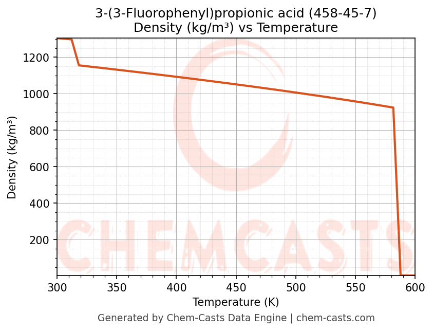 This page presents the temperature-dependent thermodynamic and transport properties of 3-(3-Fluorophenyl)propionic acid (CAS 458-45-7) calculated at a constant pressure of 1 atm (101325 Pa) over the temperature range 250-500 K.
