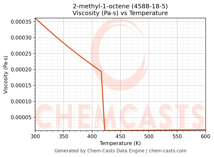 This page presents the temperature-dependent thermodynamic and transport properties of 2-methyl-1-octene (CAS 4588-18-5) calculated at a constant pressure of 1 atm (101325 Pa) over the temperature range 250-500 K.