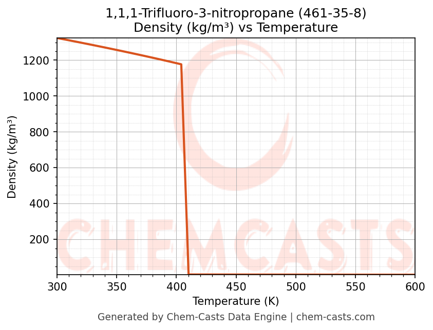 This page presents the temperature-dependent thermodynamic and transport properties of 1,1,1-Trifluoro-3-nitropropane (CAS 461-35-8) calculated at a constant pressure of 1 atm (101325 Pa) over the temperature range 250-500 K.