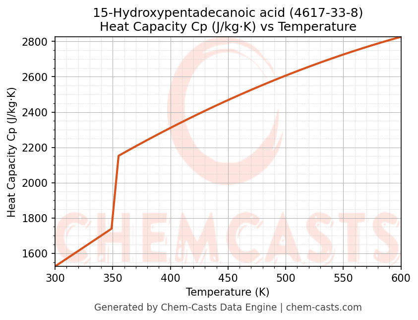 - Specific heat capacity (Cp) indicates the amount of energy required to raise the temperature of 15-Hydroxypentadecanoic acid and is critical for energy balance and heat-exchanger design.