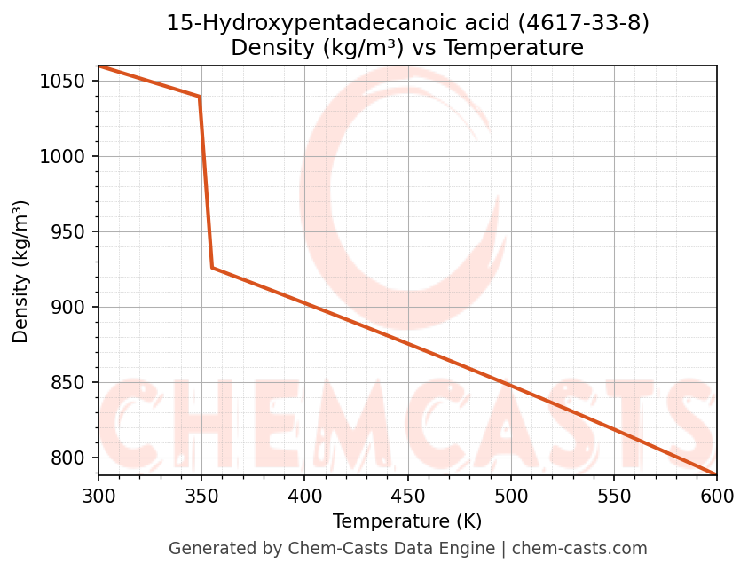 This page presents the temperature-dependent thermodynamic and transport properties of 15-Hydroxypentadecanoic acid (CAS 4617-33-8) calculated at a constant pressure of 1 atm (101325 Pa) over the temperature range 250-500 K.