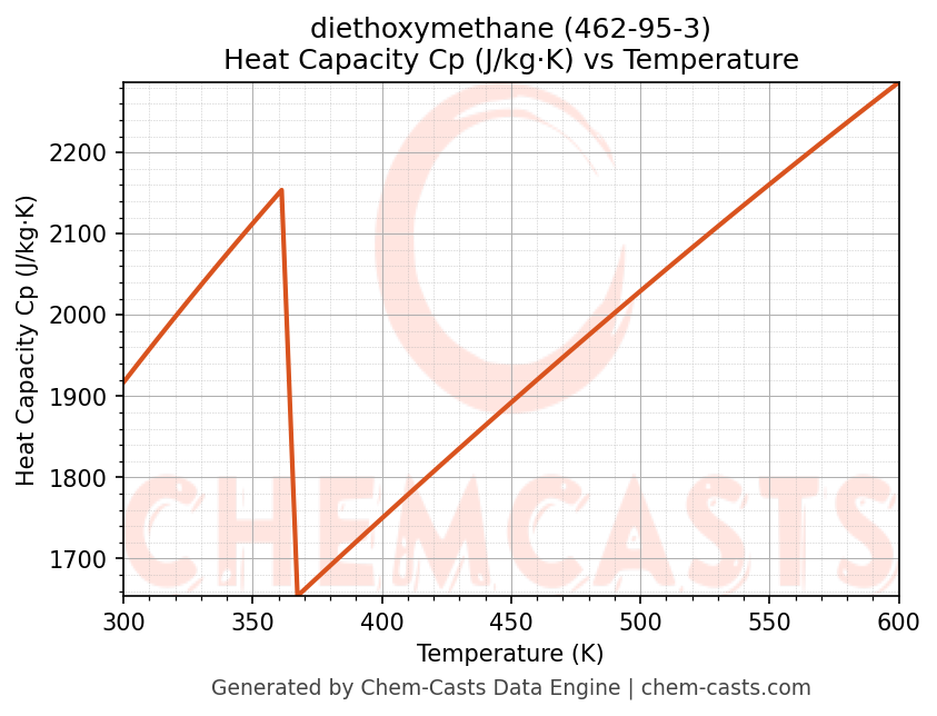 - Specific heat capacity (Cp) indicates the amount of energy required to raise the temperature of diethoxymethane and is critical for energy balance and heat-exchanger design.