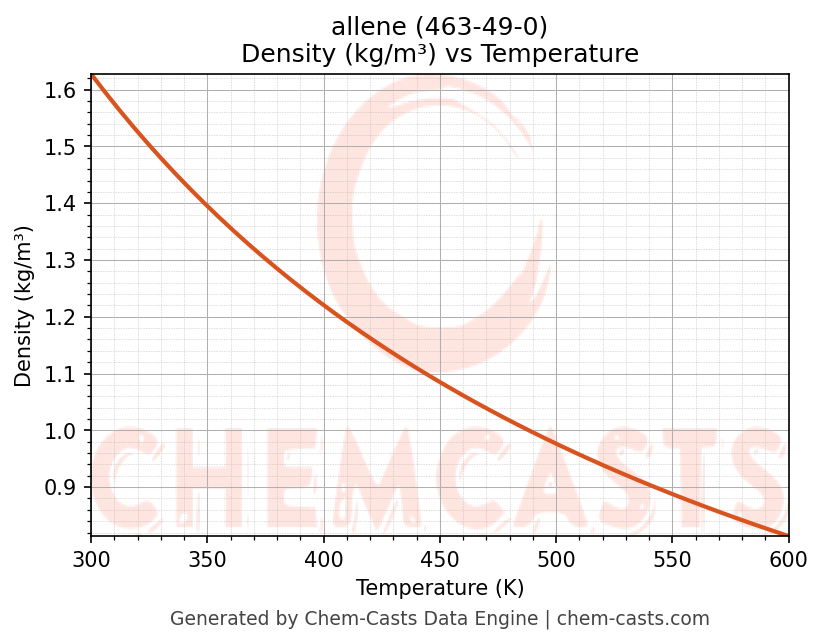 This page presents the temperature-dependent thermodynamic and transport properties of allene (CAS 463-49-0) calculated at a constant pressure of 1 atm (101325 Pa) over the temperature range 250-500 K.