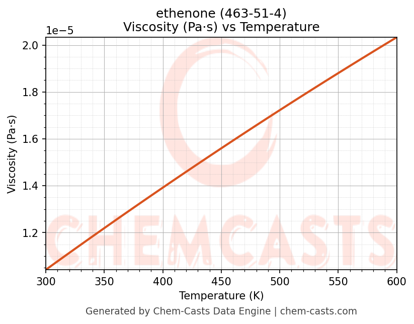 This page presents the temperature-dependent thermodynamic and transport properties of ethenone (CAS 463-51-4) calculated at a constant pressure of 1 atm (101325 Pa) over the temperature range 250-500 K.