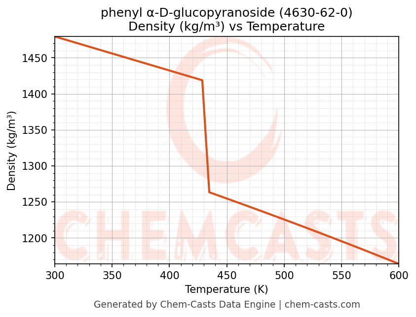This page presents the temperature-dependent thermodynamic and transport properties of phenyl α-D-glucopyranoside (CAS 4630-62-0) calculated at a constant pressure of 1 atm (101325 Pa) over the temperature range 250-500 K.