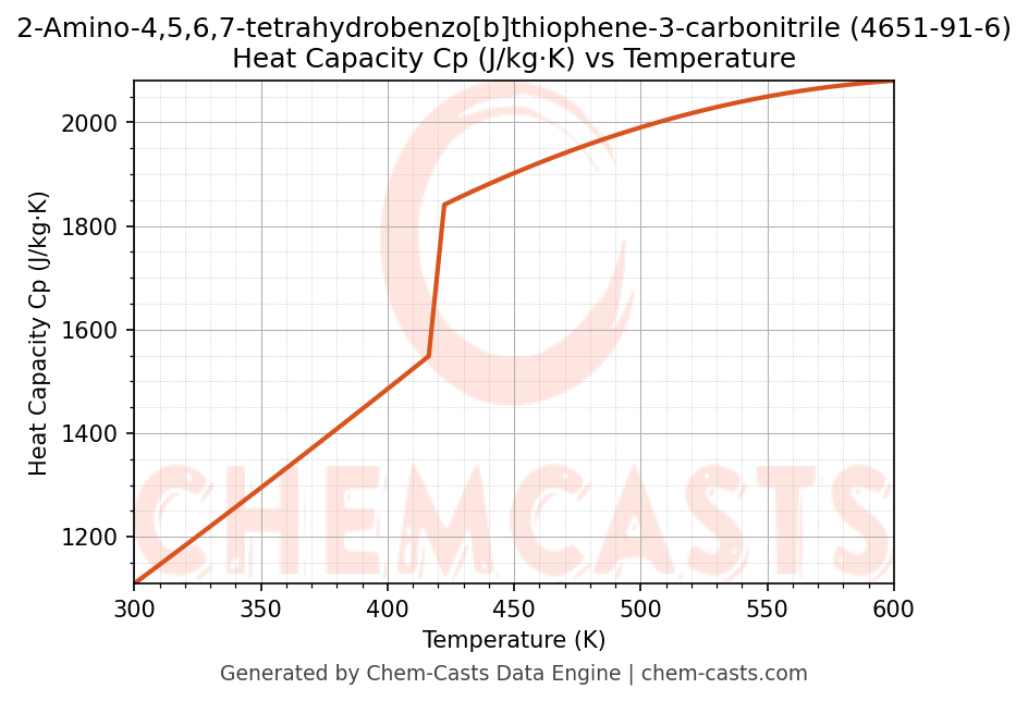 ![Heat Capacity (Cp) vs Temperature chart for 2-Amino-4,5,6,7-tetrahydrobenzo[b]thiophene-3-carbonitrile (CAS 4651-91-6)](https://chemcasts-prod.s3.ap-south-1.amazonaws.com/chem_plots_pconst/4651-91-6-cp.png)