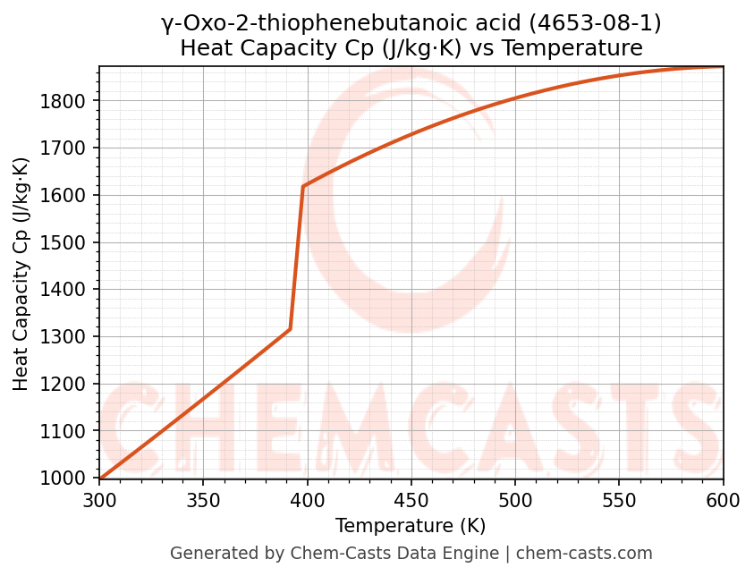 - Specific heat capacity (Cp) indicates the amount of energy required to raise the temperature of γ-Oxo-2-thiophenebutanoic acid and is critical for energy balance and heat-exchanger design.