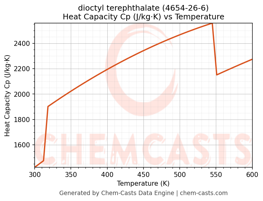 - Specific heat capacity (Cp) indicates the amount of energy required to raise the temperature of dioctyl terephthalate and is critical for energy balance and heat-exchanger design.