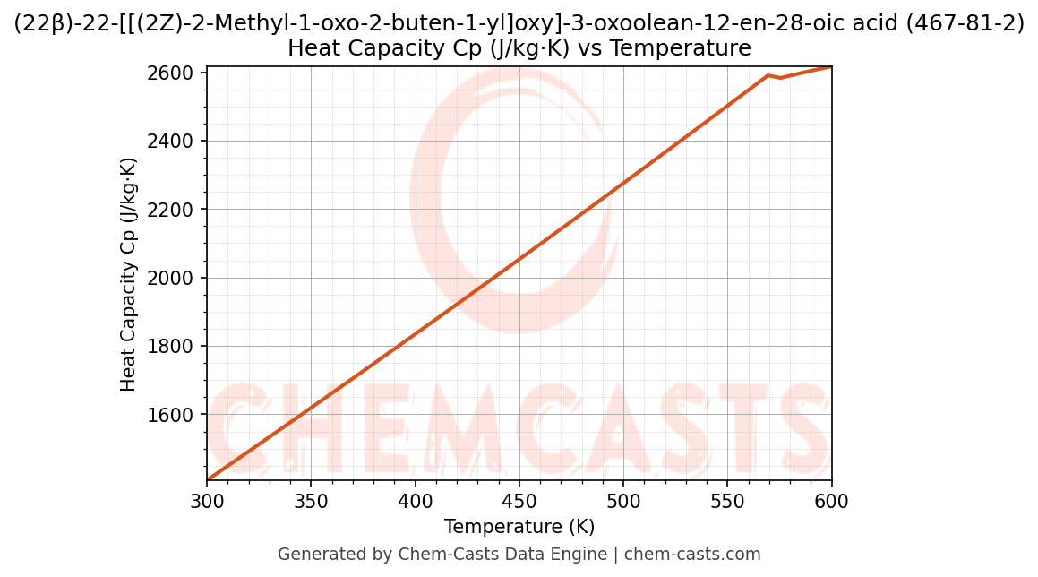 ![Heat Capacity (Cp) vs Temperature chart for (22β)-22-[[(2Z)-2-Methyl-1-oxo-2-buten-1-yl]oxy]-3-oxoolean-12-en-28-oic acid (CAS 467-81-2)](https://chemcasts-prod.s3.ap-south-1.amazonaws.com/chem_plots_pconst/467-81-2-cp.png)