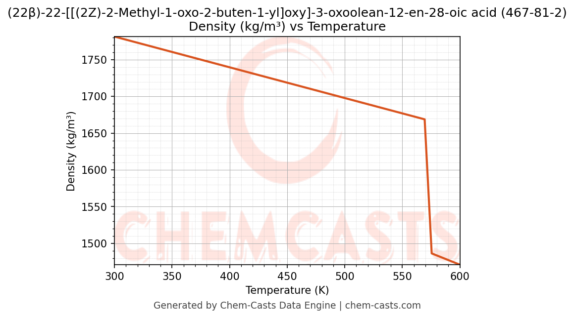 ![Density vs Temperature chart for (22β)-22-[[(2Z)-2-Methyl-1-oxo-2-buten-1-yl]oxy]-3-oxoolean-12-en-28-oic acid (CAS 467-81-2)](https://chemcasts-prod.s3.ap-south-1.amazonaws.com/chem_plots_pconst/467-81-2-density.png)