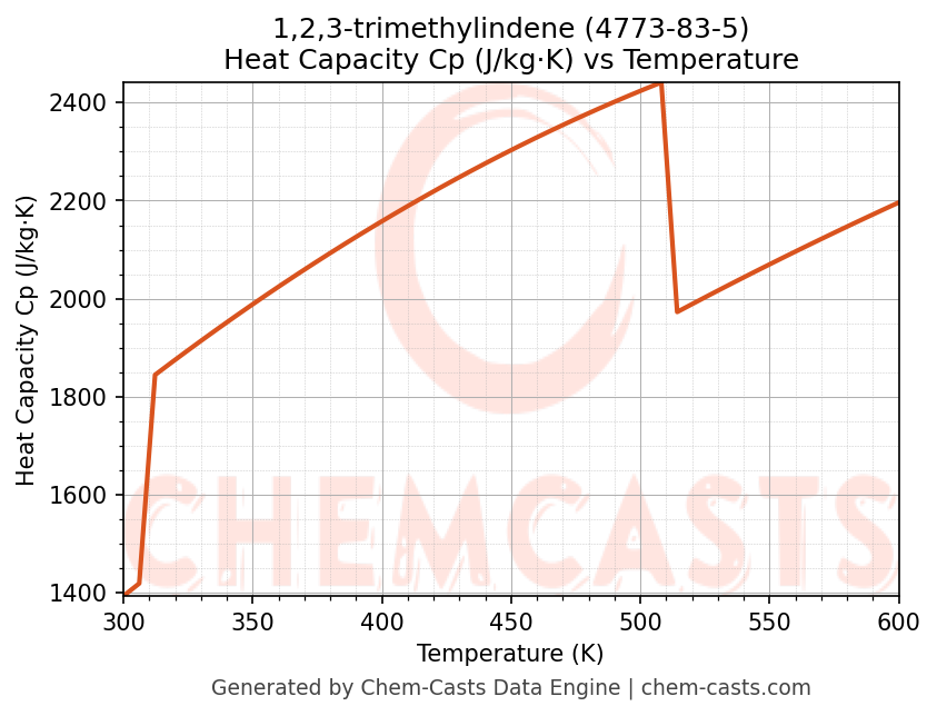 - Specific heat capacity (Cp) indicates the amount of energy required to raise the temperature of 1,2,3-trimethylindene and is critical for energy balance and heat-exchanger design.