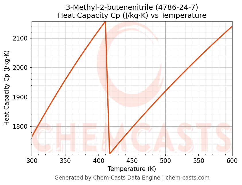 - Specific heat capacity (Cp) indicates the amount of energy required to raise the temperature of 3-Methyl-2-butenenitrile and is critical for energy balance and heat-exchanger design.