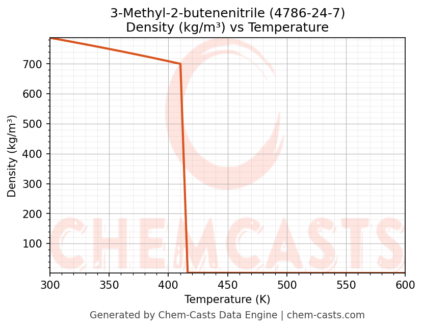 This page presents the temperature-dependent thermodynamic and transport properties of 3-Methyl-2-butenenitrile (CAS 4786-24-7) calculated at a constant pressure of 1 atm (101325 Pa) over the temperature range 250-500 K.