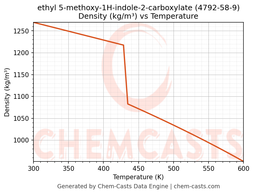 This page presents the temperature-dependent thermodynamic and transport properties of ethyl 5-methoxy-1H-indole-2-carboxylate (CAS 4792-58-9) calculated at a constant pressure of 1 atm (101325 Pa) over the temperature range 250-500 K.