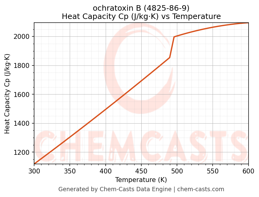 This page presents the temperature-dependent thermodynamic and transport properties of ochratoxin B (CAS 4825-86-9) calculated at a constant pressure of 1 atm (101325 Pa) over the temperature range 250-500 K.