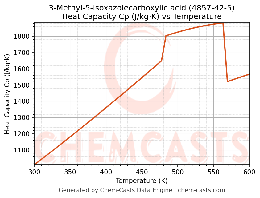 - Specific heat capacity (Cp) indicates the amount of energy required to raise the temperature of 3-Methyl-5-isoxazolecarboxylic acid and is critical for energy balance and heat-exchanger design.