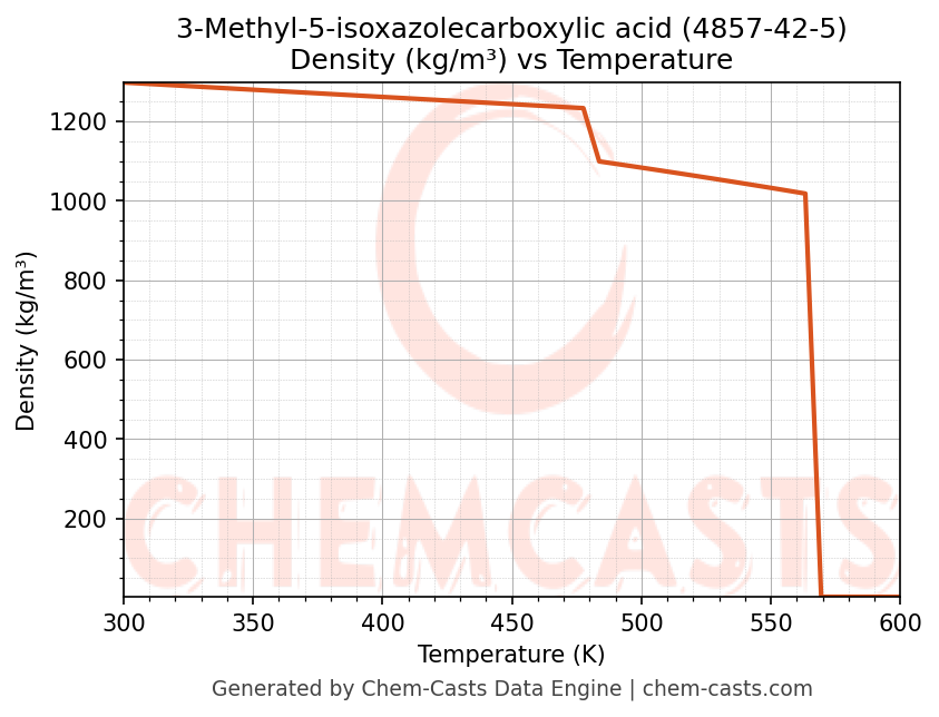 This page presents the temperature-dependent thermodynamic and transport properties of 3-Methyl-5-isoxazolecarboxylic acid (CAS 4857-42-5) calculated at a constant pressure of 1 atm (101325 Pa) over the temperature range 250-500 K.