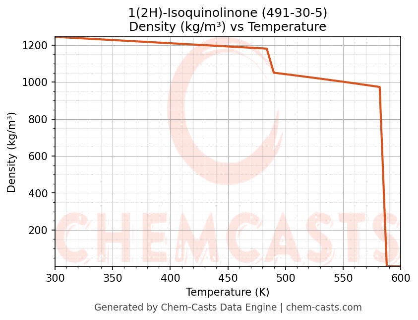 This page presents the temperature-dependent thermodynamic and transport properties of 1(2H)-Isoquinolinone (CAS 491-30-5) calculated at a constant pressure of 1 atm (101325 Pa) over the temperature range 250-500 K.