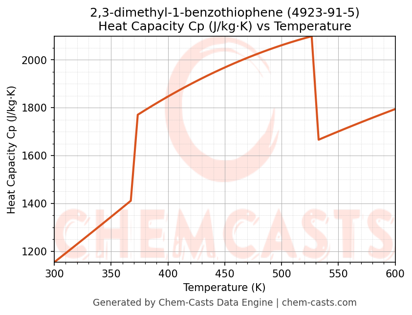- Specific heat capacity (Cp) indicates the amount of energy required to raise the temperature of 2,3-dimethyl-1-benzothiophene and is critical for energy balance and heat-exchanger design.