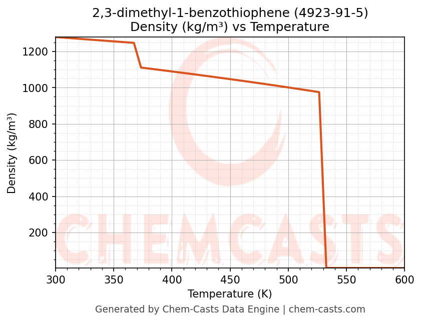 This page presents the temperature-dependent thermodynamic and transport properties of 2,3-dimethyl-1-benzothiophene (CAS 4923-91-5) calculated at a constant pressure of 1 atm (101325 Pa) over the temperature range 250-500 K.
