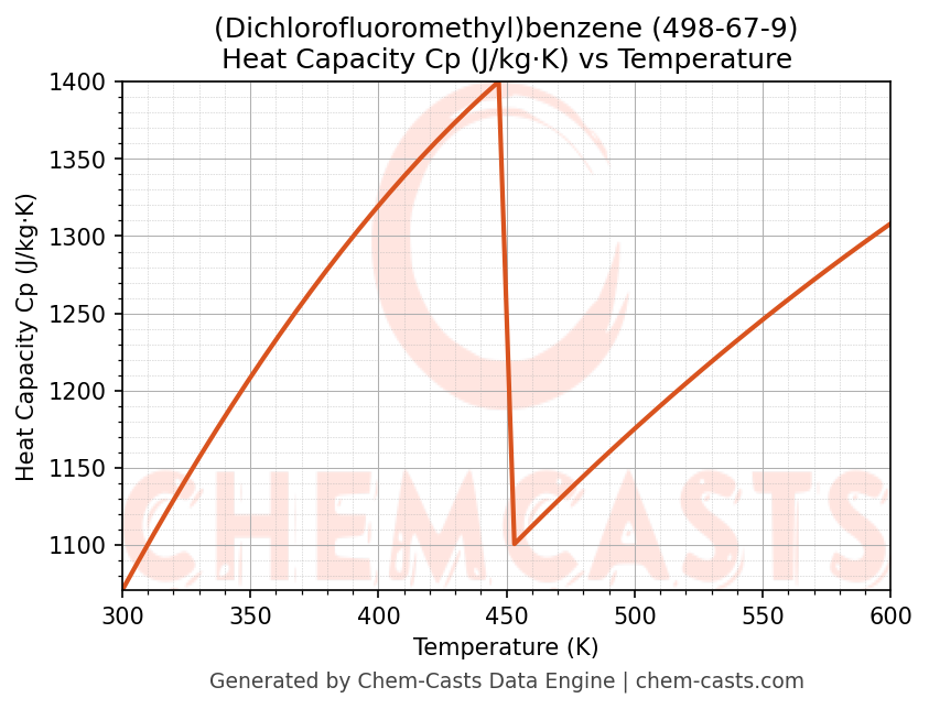 - Specific heat capacity (Cp) indicates the amount of energy required to raise the temperature of (Dichlorofluoromethyl)benzene and is critical for energy balance and heat-exchanger design.