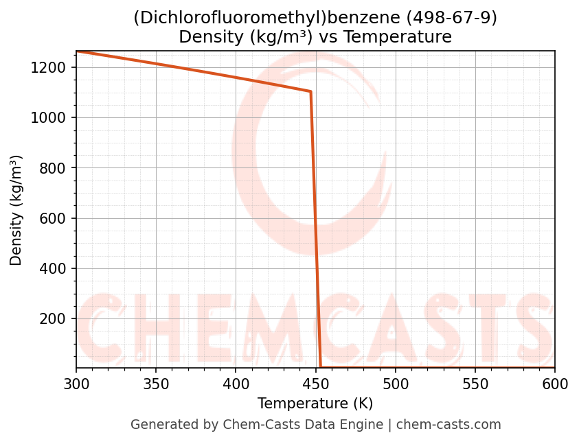 This page presents the temperature-dependent thermodynamic and transport properties of (Dichlorofluoromethyl)benzene (CAS 498-67-9) calculated at a constant pressure of 1 atm (101325 Pa) over the temperature range 250-500 K.