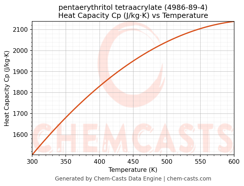 - Specific heat capacity (Cp) indicates the amount of energy required to raise the temperature of pentaerythritol tetraacrylate and is critical for energy balance and heat-exchanger design.