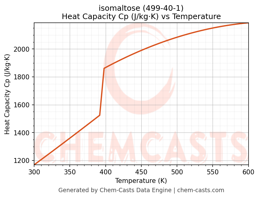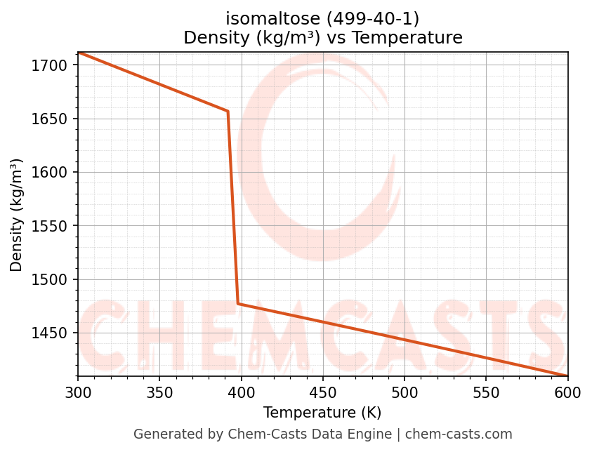 This page presents the temperature-dependent thermodynamic and transport properties of isomaltose (CAS 499-40-1) calculated at a constant pressure of 1 atm (101325 Pa) over the temperature range 250-500 K.