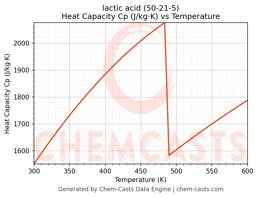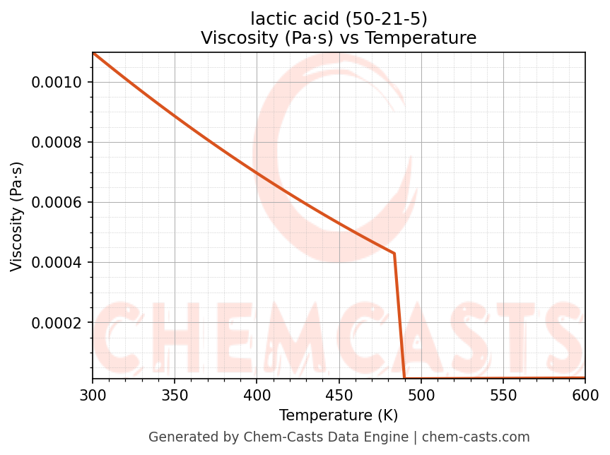 This page presents the temperature-dependent thermodynamic and transport properties of lactic acid (CAS 50-21-5) calculated at a constant pressure of 1 atm (101325 Pa) over the temperature range 250-500 K.