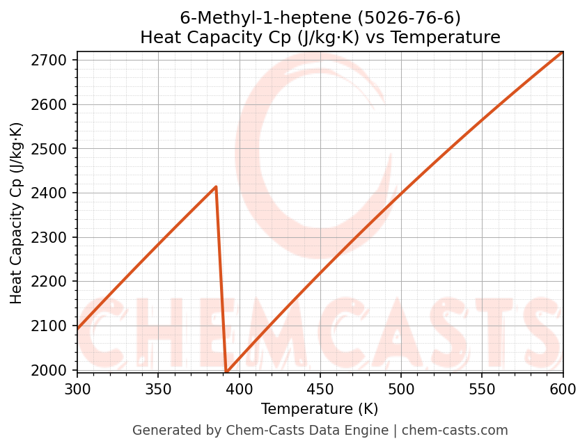 - Specific heat capacity (Cp) indicates the amount of energy required to raise the temperature of 6-Methyl-1-heptene and is critical for energy balance and heat-exchanger design.