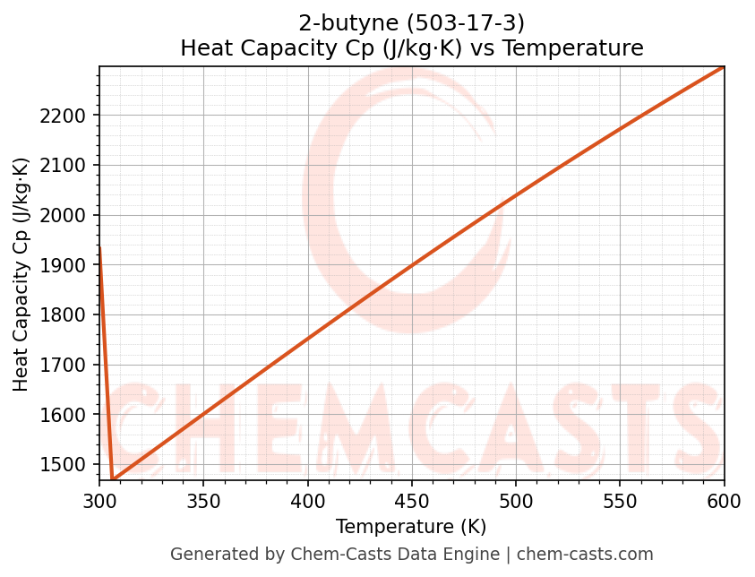 - Specific heat capacity (Cp) indicates the amount of energy required to raise the temperature of 2-butyne and is critical for energy balance and heat-exchanger design.