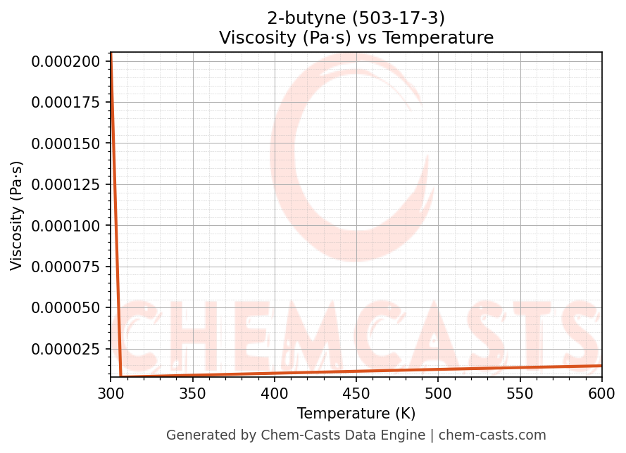 This page presents the temperature-dependent thermodynamic and transport properties of 2-butyne (CAS 503-17-3) calculated at a constant pressure of 1 atm (101325 Pa) over the temperature range 250-500 K.