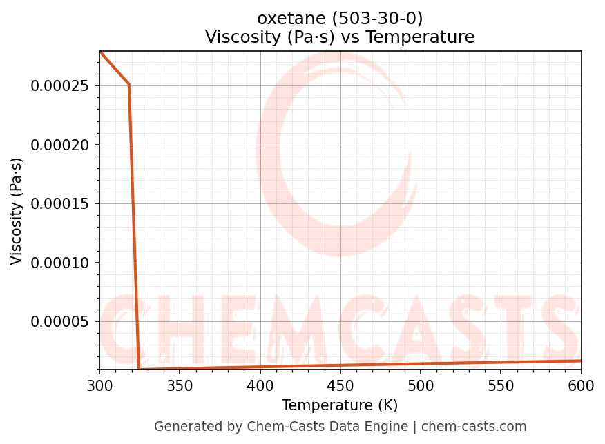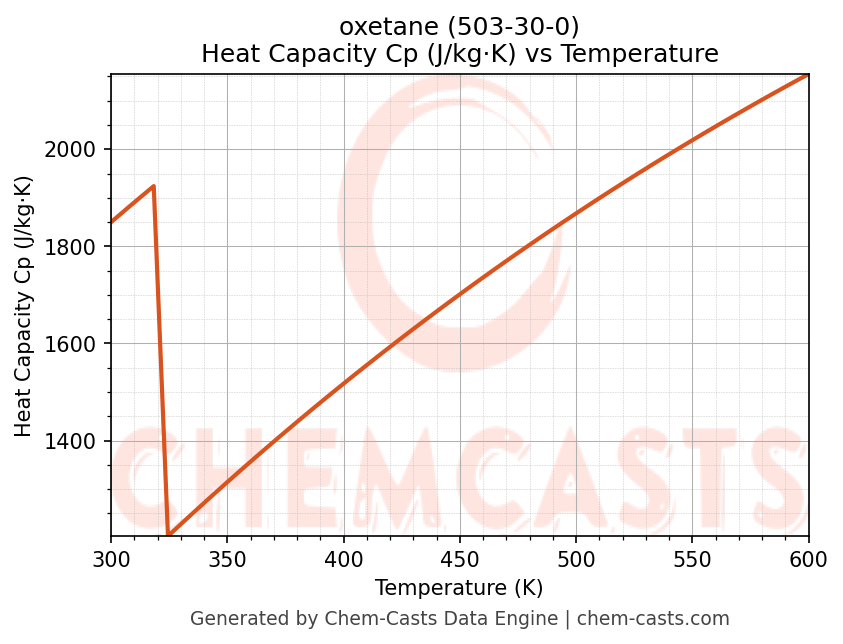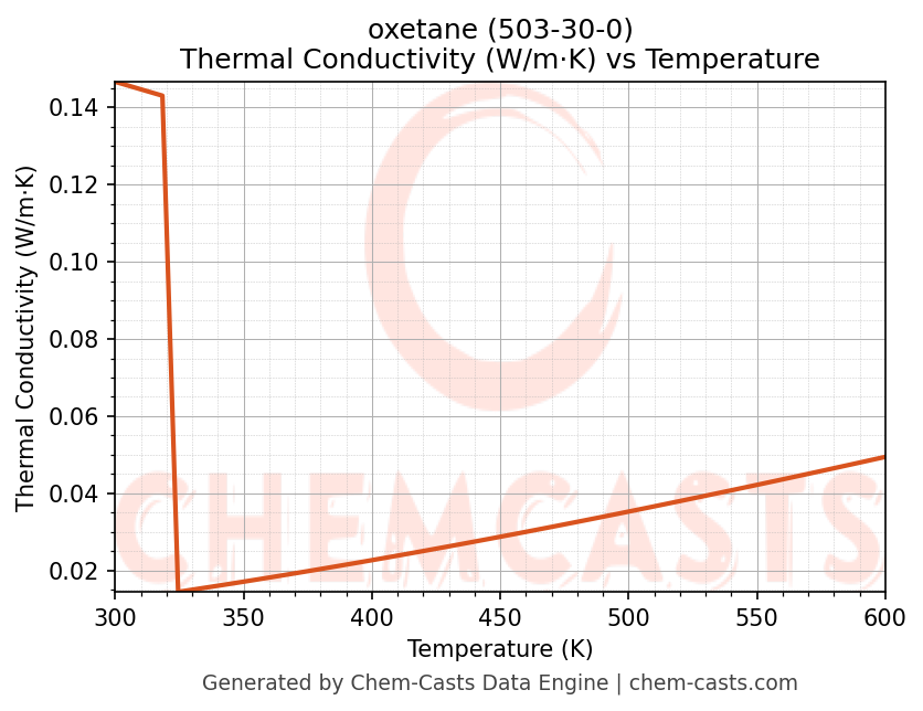 This page presents the temperature-dependent thermodynamic and transport properties of oxetane (CAS 503-30-0) calculated at a constant pressure of 1 atm (101325 Pa) over the temperature range 250-500 K.