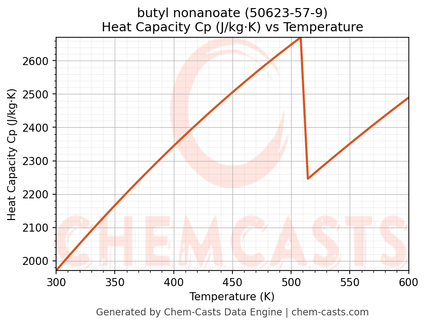 - Specific heat capacity (Cp) indicates the amount of energy required to raise the temperature of butyl nonanoate and is critical for energy balance and heat-exchanger design.