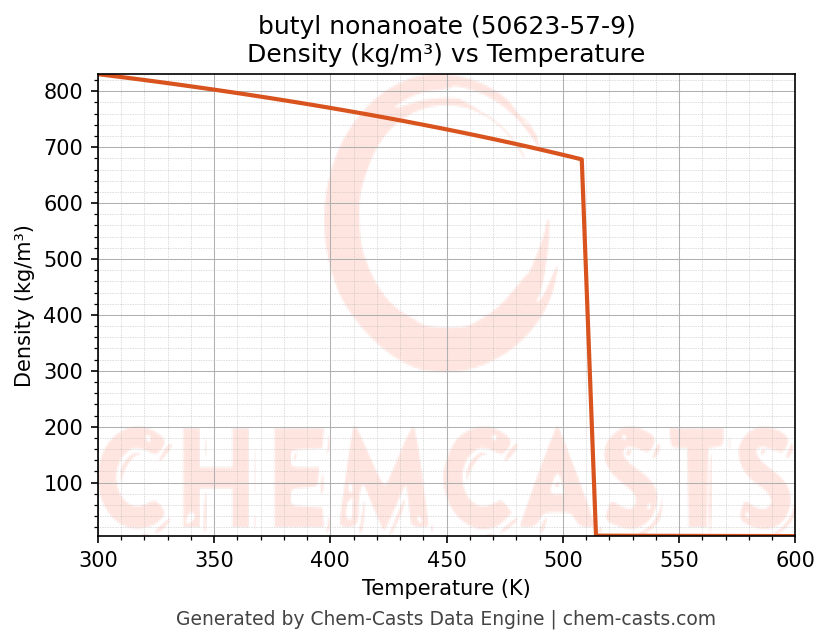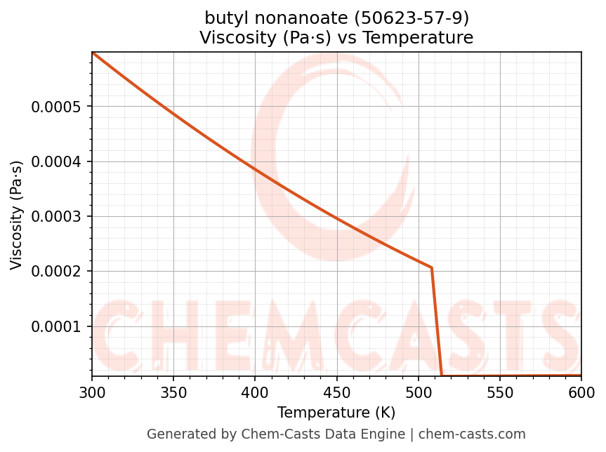 This page presents the temperature-dependent thermodynamic and transport properties of butyl nonanoate (CAS 50623-57-9) calculated at a constant pressure of 1 atm (101325 Pa) over the temperature range 250-500 K.