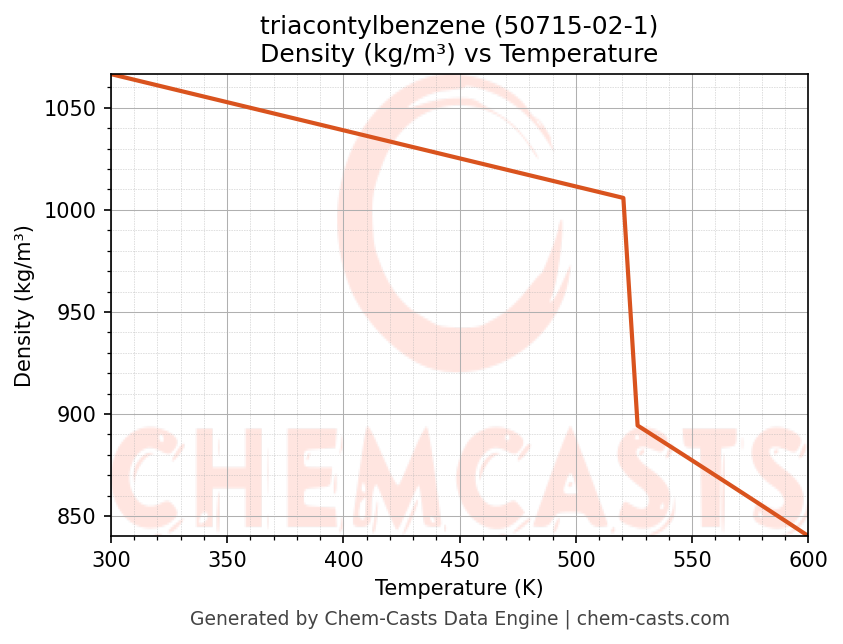 This page presents the temperature-dependent thermodynamic and transport properties of triacontylbenzene (CAS 50715-02-1) calculated at a constant pressure of 1 atm (101325 Pa) over the temperature range 250-500 K.
