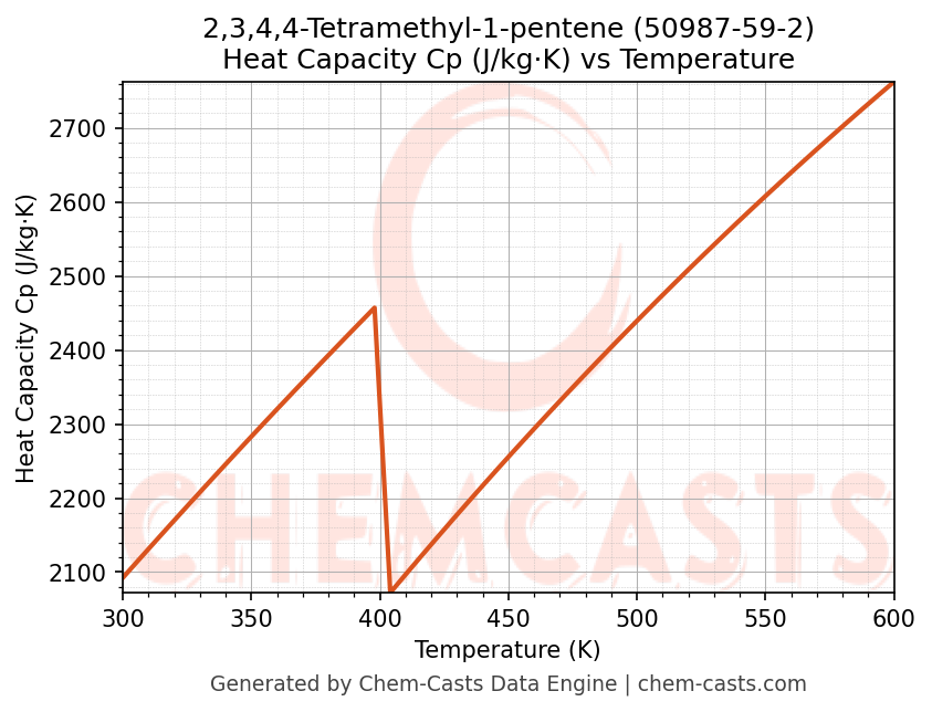 - Specific heat capacity (Cp) indicates the amount of energy required to raise the temperature of 2,3,4,4-Tetramethyl-1-pentene and is critical for energy balance and heat-exchanger design.