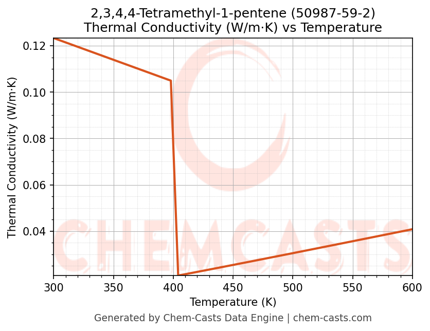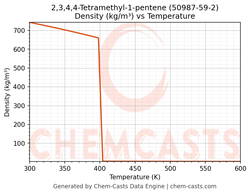 This page presents the temperature-dependent thermodynamic and transport properties of 2,3,4,4-Tetramethyl-1-pentene (CAS 50987-59-2) calculated at a constant pressure of 1 atm (101325 Pa) over the temperature range 250-500 K.