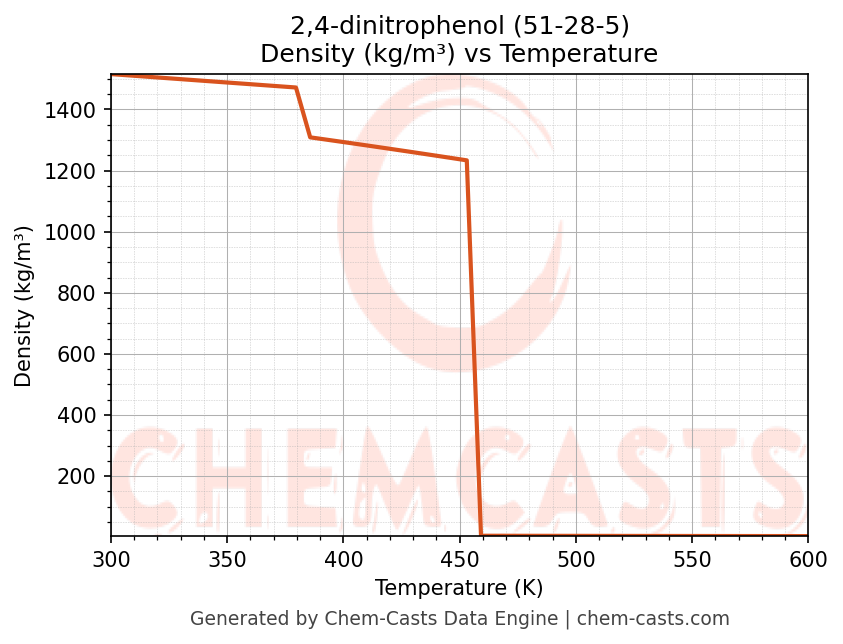This page presents the temperature-dependent thermodynamic and transport properties of 2,4-dinitrophenol (CAS 51-28-5) calculated at a constant pressure of 1 atm (101325 Pa) over the temperature range 250-500 K.