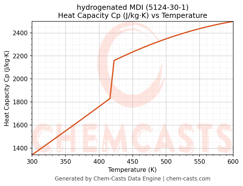 This page presents the temperature-dependent thermodynamic and transport properties of hydrogenated MDI (CAS 5124-30-1) calculated at a constant pressure of 1 atm (101325 Pa) over the temperature range 250-500 K.