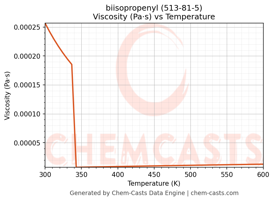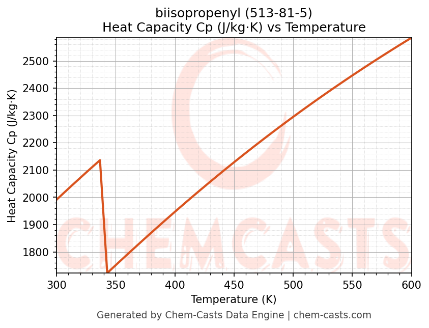 - Specific heat capacity (Cp) indicates the amount of energy required to raise the temperature of biisopropenyl and is critical for energy balance and heat-exchanger design.