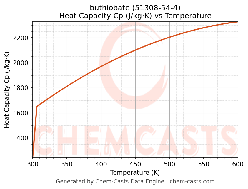 - Specific heat capacity (Cp) indicates the amount of energy required to raise the temperature of buthiobate and is critical for energy balance and heat-exchanger design.