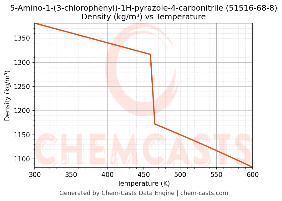 This page presents the temperature-dependent thermodynamic and transport properties of 5-Amino-1-(3-chlorophenyl)-1H-pyrazole-4-carbonitrile (CAS 51516-68-8) calculated at a constant pressure of 1 atm (101325 Pa) over the temperature range 250-500 K.