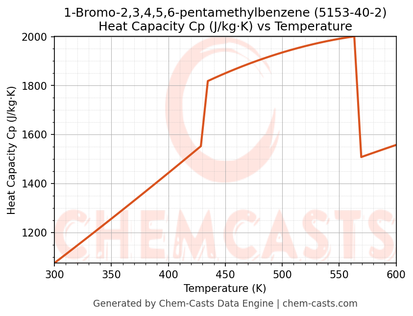 - Specific heat capacity (Cp) indicates the amount of energy required to raise the temperature of 1-Bromo-2,3,4,5,6-pentamethylbenzene and is critical for energy balance and heat-exchanger design.