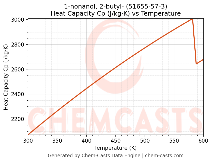 - Specific heat capacity (Cp) indicates the amount of energy required to raise the temperature of 1-nonanol, 2-butyl- and is critical for energy balance and heat-exchanger design.