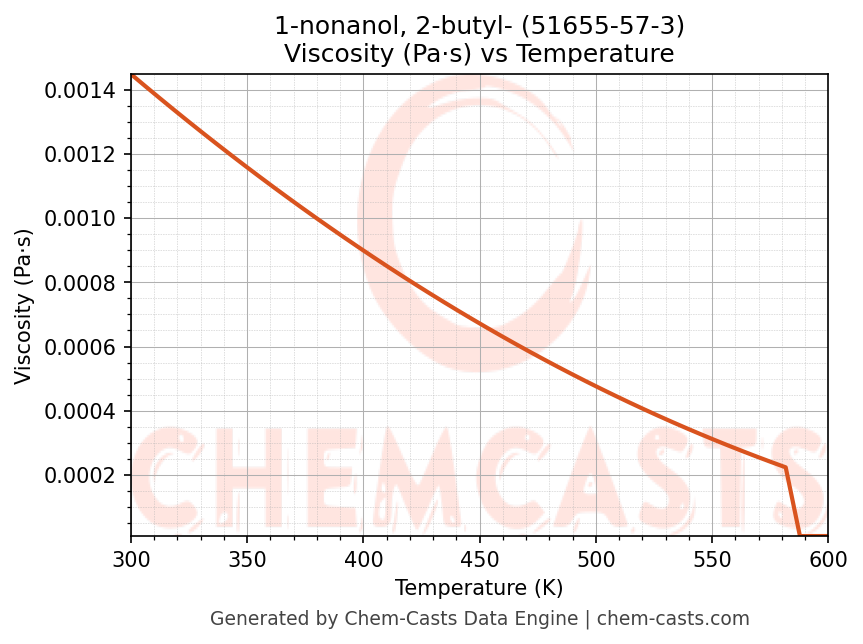 This page presents the temperature-dependent thermodynamic and transport properties of 1-nonanol, 2-butyl- (CAS 51655-57-3) calculated at a constant pressure of 1 atm (101325 Pa) over the temperature range 250-500 K.