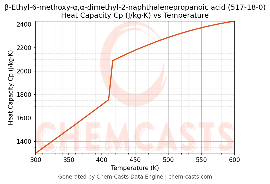- Specific heat capacity (Cp) indicates the amount of energy required to raise the temperature of β-Ethyl-6-methoxy-α,α-dimethyl-2-naphthalenepropanoic acid and is critical for energy balance and heat-exchanger design.